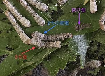 2令は期間が一番短く、2日間で眠に入ってしまいます。16日(日)の夕方から2令がスタートしましたので、本日はまだ現れていませんが、もしかすると明日の朝には眠蚕が現れているかもしれません・・・