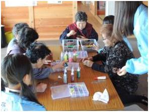 南相馬市鹿島区千倉応急仮設住宅の集会所では、松ぼっくり工作とキーホルダー作りを行いました。たくさんの人が来てくださり、楽しんでいただけたので良かったです。