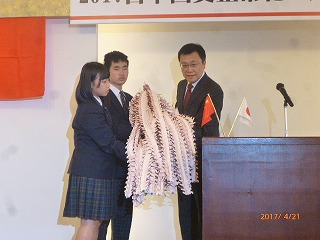 4月21日に石川県日本中国友好協会が主催する2017日中国交正常化45周年記念大会にて、駐名古屋中華人民共和国総領事館の鄧偉総領事(トウ・イ そうりょうじ)に千羽トキを贈らせていただきました。