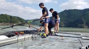男子ダブルスカル試合に向けて蹴りだしです サポート体制もしっかりしてます