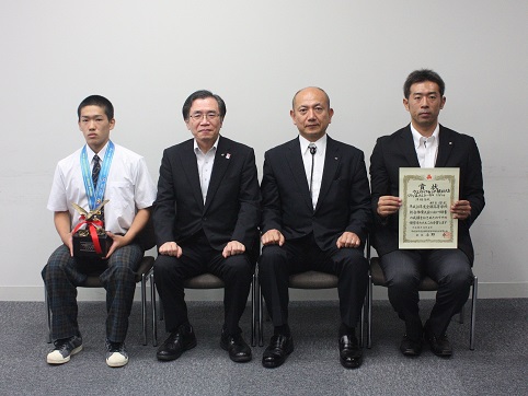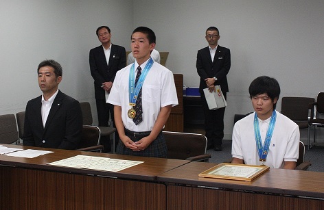 8月20日(水)、全国高等学校総合体育大会ウエイトリフティング競技53kg級で優勝した柳生輝紀君(本校体育科3年、宇ノ気中学校出身)の、かほく市と津幡町への表敬訪問を行いました。柳生選手の優勝の喜びの気持ちをはじめ、減量の苦労話、ウエイトリフティング競技の特徴や面白さなど、多くの報告を和やかな雰囲気でおこないました。10月に開催される国民体育大会で再度優勝の報告をできるように頑張るという柳生選手の決意表明で会を締めくくりました。