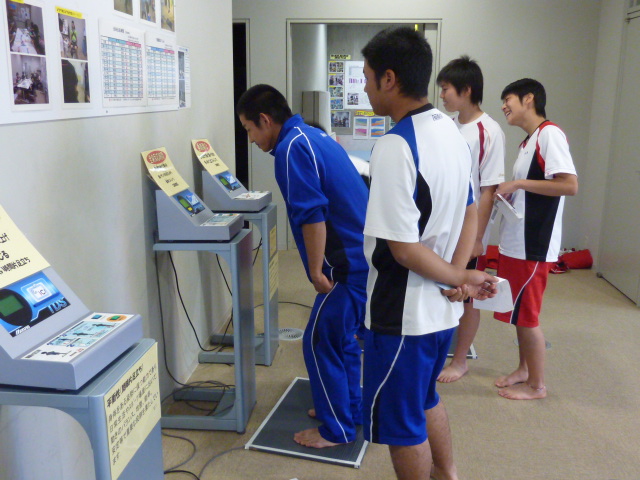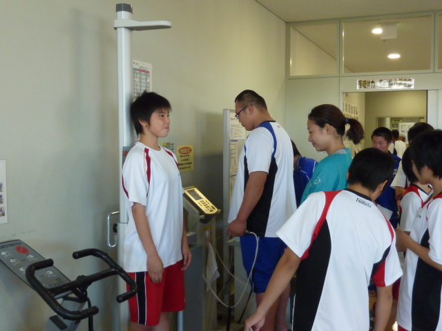 自分のスマートフォンを投影するなどの工夫をしながら、実際に、いしかわ総合スポーツセンターで測定した結果を基に1日の推定エネルギー必要量を計算させていました。 柔道部重量級の生徒では、「5000kcal」と計算され、女子から「わー」という声がもれていました。具体的な値が示され、納得もできたようです。自分の経験からおすすめできるプロテインなどの、さらに具体的な話もあり、生徒もさることながら聞いている自分も話の中に引き込まれる授業でした。