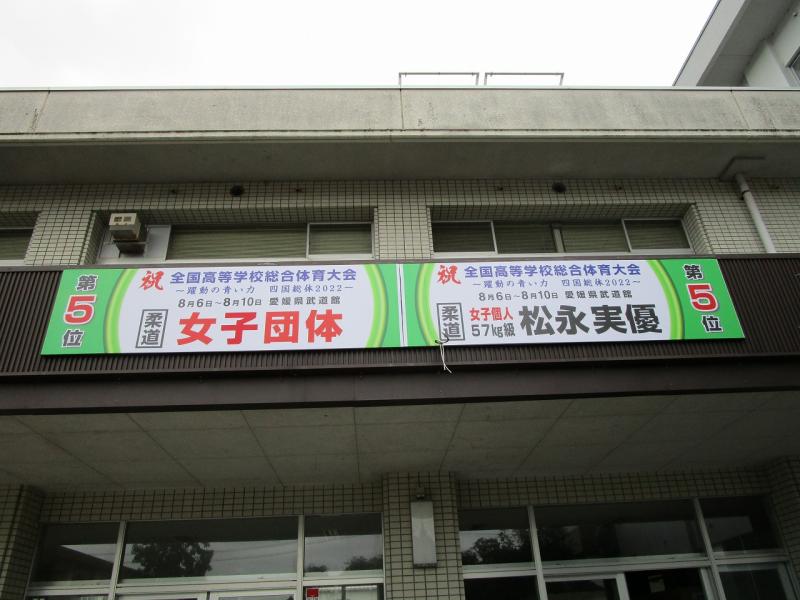 生徒玄関に10月2日、栃木県で開催される第77回国民体育大会出場者の名前を載せた激励パネルを設置しました。併せて夏のインターハイで女子柔道団体5位、女子個人5位松永選手の入賞を祝福したパネルも設置しました。