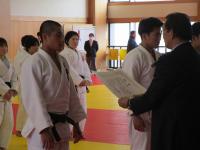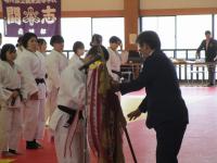 前日の2月29日(木)に柔道部送別会を行い、後輩よりメッセージの入った色紙と卒業記念の帯が手渡されました。