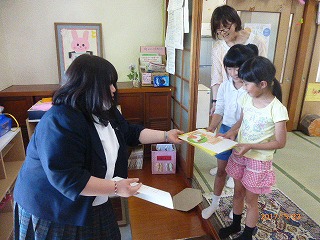 4月26日に津幡町立中条東保育園にて、「ねぇトキってしってる?」絵本と「ニッポンをもういちど日本の空へ」ポスターの配布活動を行いました。この日は、日中朱鷺保護協会会長の大深さんよりトキのポスター贈呈していただき、トッキーメッキーからトキの絵本を贈呈しました。また、その後に行った工作教室も大好評でした。