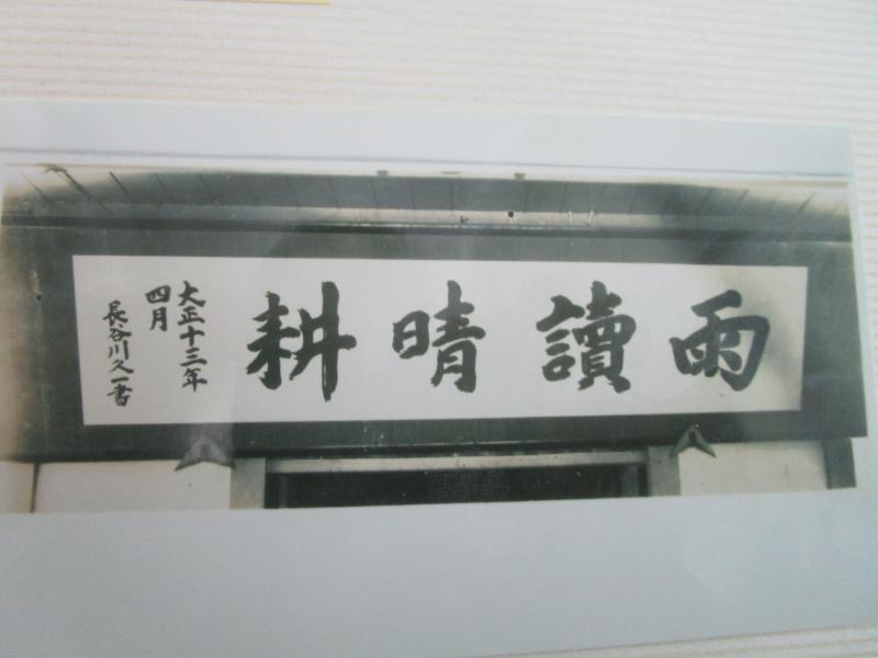『津幡高等学校五十年史』には「大正13年(1924)四月、当時の長谷川知事は「雨読晴耕」の四文字の揮毫を三浦校長(農蚕学校初代校長)に授けられ、それより本校の校訓として」とある。また『同窓会報』や『同窓会誌』にも当時の思い出として紹介される四文字である。