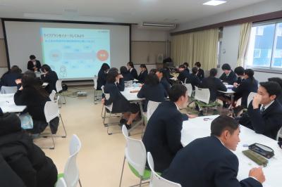 1月25日(木)に3年生を対象として、男子はスーツの着こなしセミナー、女子はビジネス用のお化粧講座が行われました。男子のセミナーでは、「身だしなみ」と「おしゃれ」の違いについて説明がありました。様々な場に応じて適切な身だしなみを心掛けたいですね。