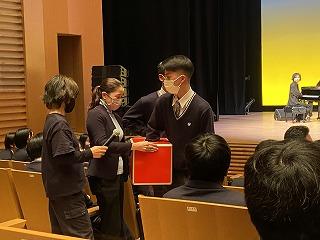 最後は、文化委員長である3年生の桜井雅友さんが、お礼の言葉と花束の贈呈を行いました。
