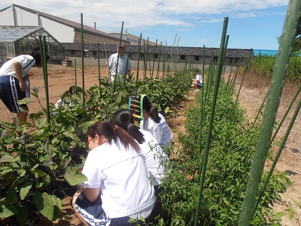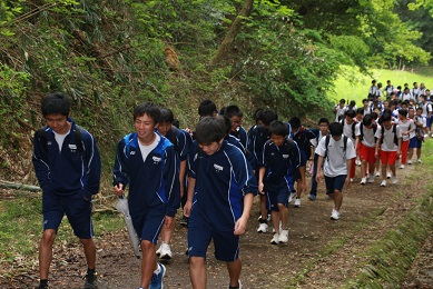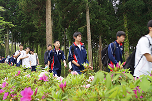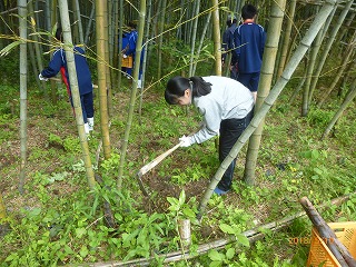 今年度は開催日が例年よりも若干遅かったため、「タケノコ掘り」に加えて、「タケノコ切り」活動を行いました。生徒たちは身の丈以上もある巨大なタコノコを相手に、鎌や、ノコギリ、鍬を駆使して、精一杯活動を行っていました。今回のボランティア活動には、生徒会を中心に、サッカー・ボート・バドミントン・茶道・華道・科学・園芸・JRCなど、多くの部活動の生徒が参加してくれました。参加人数も、生徒・教職員を含めて過去最多の総勢約60人となり、良い活動になったと思います。