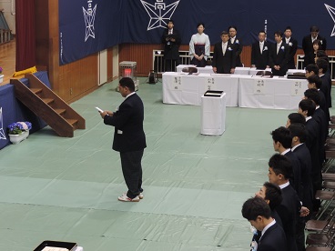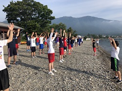 ↓青いウェアの現地指導員さんと開校式です。 | ↓生徒代表による挨拶です。 |