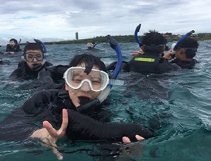 ↓今日は海で実習です。 | ↓名護市ゴリラチョップはダイビングで有名です。 |