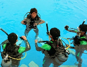 ↓宜野湾マリン支援センター | ↓講習と筆記試験の後のプールでの実技です。 |