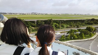 ↓背景は嘉手納基地です。 | ↓基地がある沖縄の人々の生活について学びました。 |