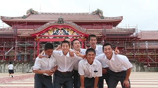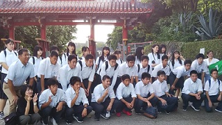 ↓お世話になったホテルの方へ記念品の贈呈です。 | ↓首里城でクラス写真を撮りました。 |