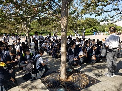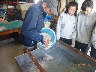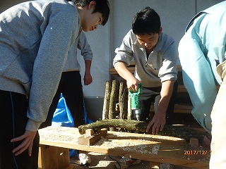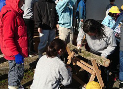 12月7日木曜日に、花と緑系列の2年生を対象に、“森の恵み教室”を行いました。当日は、連日の悪天候が嘘のような好天に恵まれ、石川県林業研究グループ連絡協議会の潟端良子さんを講師にお招きし、シイタケとナメコの原木栽培を行いました。昨年度は、猪(イノシシ)の燻製を行ったのですが、今年度は津幡町内で伐倒したコナラの原木に、シイタケとナメコの種菌を植菌しました。生徒は初めて行う作業でしたが、徐々に慣れてきて良い経験となりました。また、この日は英田小学校の6年生が見学に来ました。少しの間でしたが、協力して作業をすることができお互いに良い経験になったと思います。