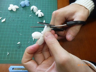 本日、花と緑系列の2年生を対象に、シルクコサージュ講習会を行いました。講師は花まゆ本部認定講師の福西泰子さんです。本校で秋に飼育していた繭と福西さんが持参して下さった繭を使って、コサージュのフラワーアレンジメントに挑戦しました。このコサージュは、今年度の卒業生にプレゼントする予定です。