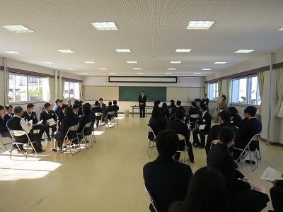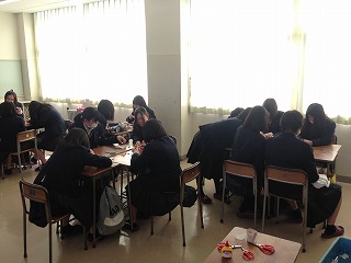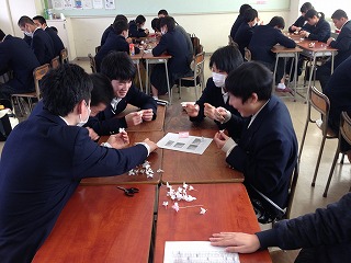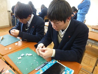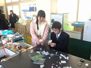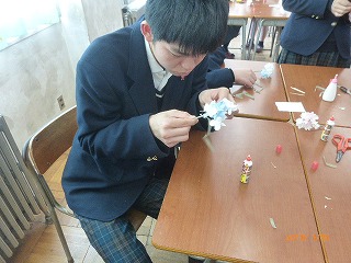 2月2日の総合学科2年生の「総合的な学習の時間」に、卒業生に送るためのシルクコサージュの制作に取り組みました。これまでは、花と緑系列の生徒だけが制作していたため、他の系列の生徒にとっては初めての体験となりました。作業は、生徒会やJRC部、園芸部などの生徒たちが今までに作ったコサージュの補修作業です。細かい作業なので、色々と大変だったと思いますが、みな真剣に取り組んでいました。