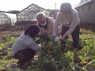 ご報告が遅くなりましたが、昨年12月に食農・環境教育プログラム(ダイコンの収穫体験)を行いました。今回は、12月13日と15日に、事前に応募があった「生活支援センター 雪見橋」と、「社会福祉法人つくしの会はぎの郷」の皆さんがそれぞれ参加して下さいました。