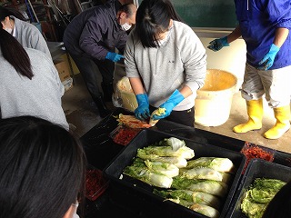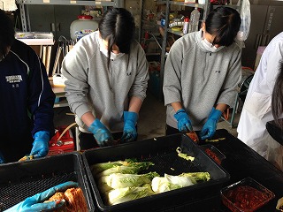 2月2日(金) キムチの袋詰めの作業がありました。このキムチは、花と緑系列の三年生が、1月19日の実習の時間に仕込んだもので、約2週間の漬け込み期間を経て取り出したものです。キムチの主役であるハクサイは本校の農場で採れたものを使用し、調味料は本格韓国料理店に注文したものを使うなど、本校自慢の自家製キムチです。