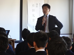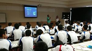 講師の石田大介先生は、本校に勤務している保健体育の先生で、アトランタオリンピック、シドニーオリンピック、と2度のオリンピックを経験している有名な競歩の選手でした。海外で活躍することが多かった現役時代や、指導者・スタッフとして海外遠征に参加することもある現在まで、外国語の必要性を常に感じてきたそうです。今回は先生のこれまでの経験の中から、外国語を生活手段として使ってきた事や、外国語をを使うことによって人とのつながりが生まれ、現在までその関係が続いていること等を話してもらいました。生徒たちは、先生が外国語を使って生活してきたことに驚きながらも、外国語をより身近に感じたようでした。