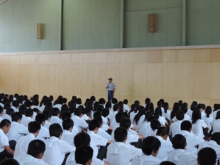 時節柄、体育館は蒸し暑く、講話を聞くのはたいへんでしたが、