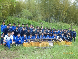 今年度は開催日が例年よりも若干遅かったため、「タケノコ掘り」に加えて、「タケノコ切り」活動を行いました。生徒たちは身の丈以上もある巨大なタコノコを相手に、鎌や、ノコギリ、鍬を駆使して、精一杯活動を行っていました。今回のボランティア活動には、生徒会を中心に、サッカー・ボート・バドミントン・茶道・華道・科学・園芸・JRCなど、多くの部活動の生徒が参加してくれました。参加人数も、生徒・教職員を含めて過去最多の総勢約60人となり、良い活動になったと思います。