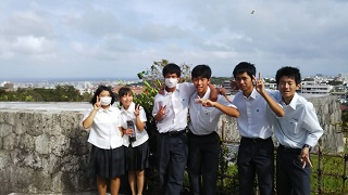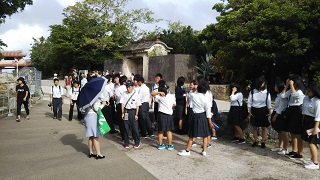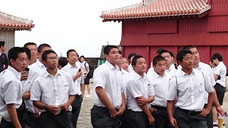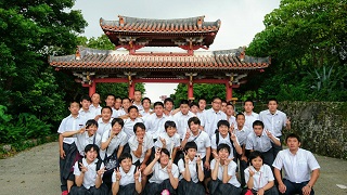 ↓お世話になったホテルの方へ記念品の贈呈です。 | ↓首里城でクラス写真を撮りました。 |
