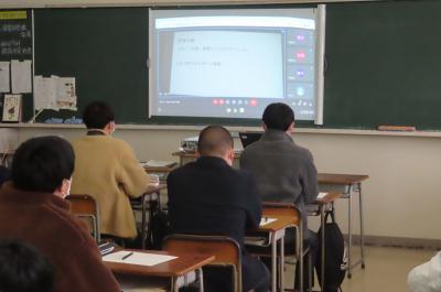 全体発表は、3年生は視聴覚室で行い、1・2年生は教室でGoogle Meetを使ってリモートで聴きました。