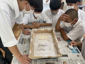 下の写真は、9月13日(月)からの飼育に向けて、飼育箱の準備をしているところと、郵送にて到着したお蚕さんの卵です。