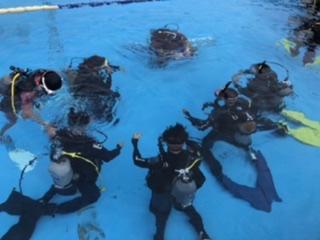 プールで明日の海洋実習に向けて、実際にタンクを担いで潜る練習をしました。