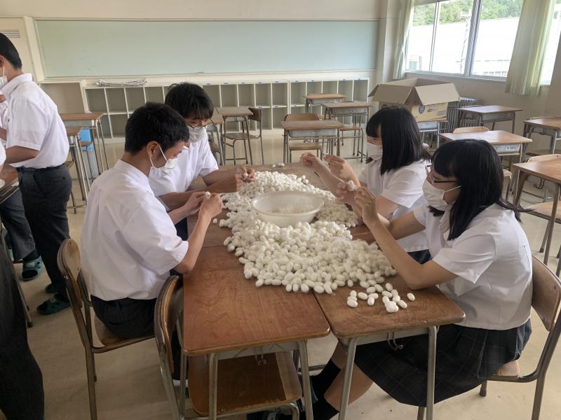 蚕を1か月半育て、できた繭の毛羽取りを行いました。