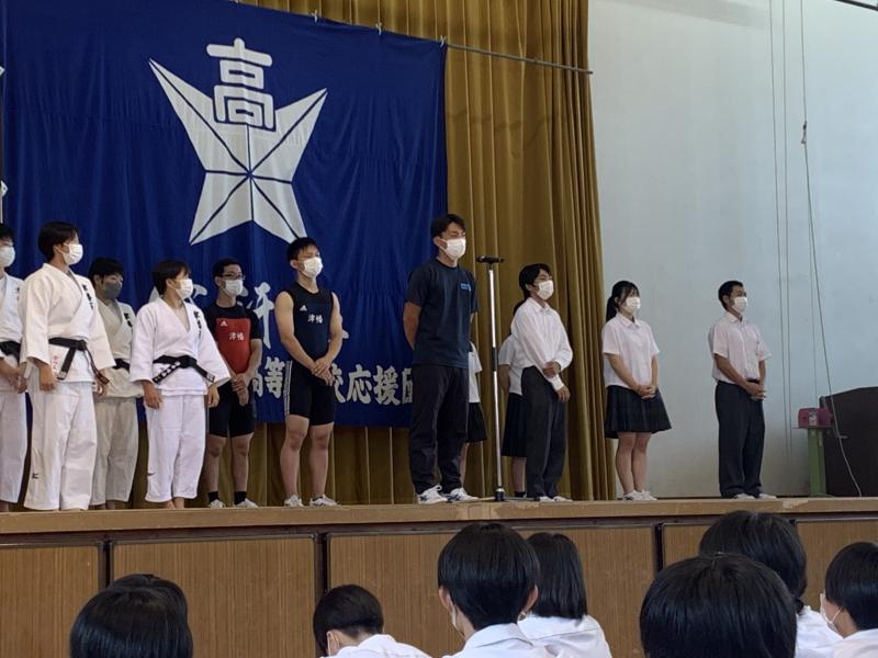 野球部の代表が活躍の決意表明をし、目標達成を祈願して全校で激励しました。