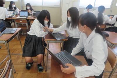 クロームブックを使い、適性診断や上級学校調べ、資料請求を行いました。