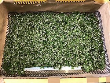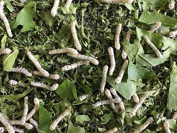 3令蚕は、桑の葉を噛む力も強くなっているので、切り桑は卒業し、ある程度の大きさに千切った桑の葉をまんべんなく、お蚕さんたちの上に敷いてあげます。