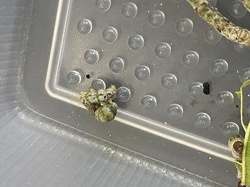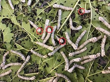 なんと、頭が緑色で腫れているお蚕さんたちが多数存在し、中には体液が出ているものいました。何かの病気かと思い、すぐに緊急隔離!!そして、毎回本校の養蚕活動に多大なるご協力を賜っています、一般財団法人 大日本蚕糸会 蚕糸科学技術研究所の常山 泉さんにご質問したところ、アリやクモ、ダニといった、害虫に噛まれてしまったのではないかというご助言を頂きました。その後、部員一同で目を凝らしながら観察はしたものの、犯人を見つけることはできませんでした。被害の大きさとしては20~30頭ほどのお蚕さんたちが犠牲となってしまい、数はそこまで多くないものの、今回の事件で尊い命を犠牲にしてしまったことは、反省点であり今後の課題であると思います。