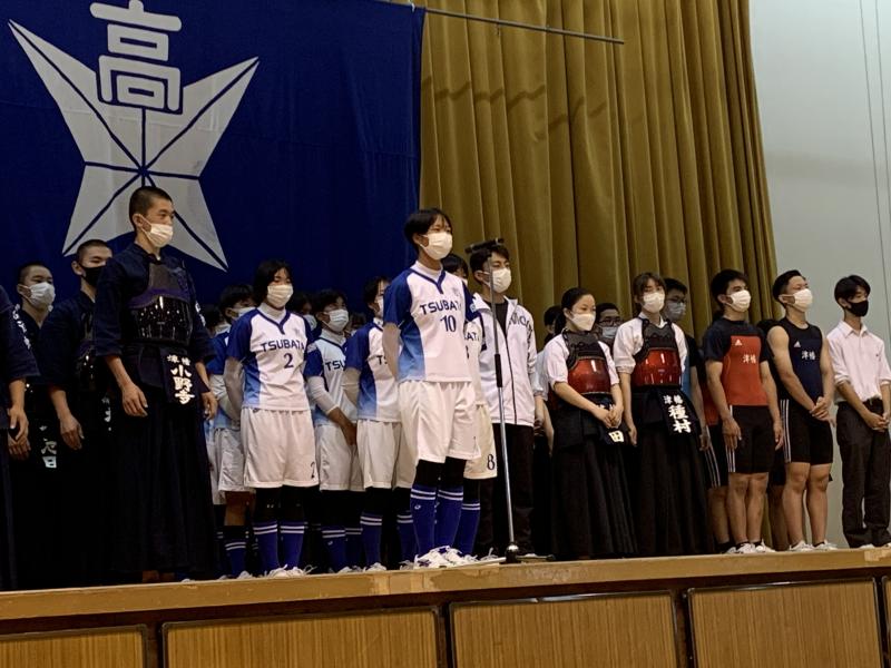 総体・総文の各部活動の大会成績の披露と、北信越大会に出場する選手の壮行式を、全校生徒で行いました。