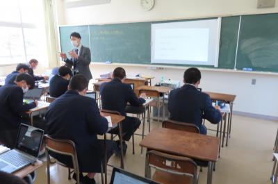進路指導課の松本先生、鋪村先生より、3年生の進路実現に向けた1年間の流れ、令和3年度卒業生の進路状況、令和4年度の進路展望などについて説明がありました。