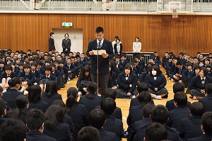 今週火曜日に対面式がありました。1年生は、まだ入学して2日目ということもあり、緊張した面持ちが見られました。初めて2・3年生と対面し、生徒会長の上谷さんが歓迎の言葉を贈り、新入生を代表して、スポーツ健康科学科の赤穂さんと総合学科の丹羽さんがお礼の言葉を返してくれました。