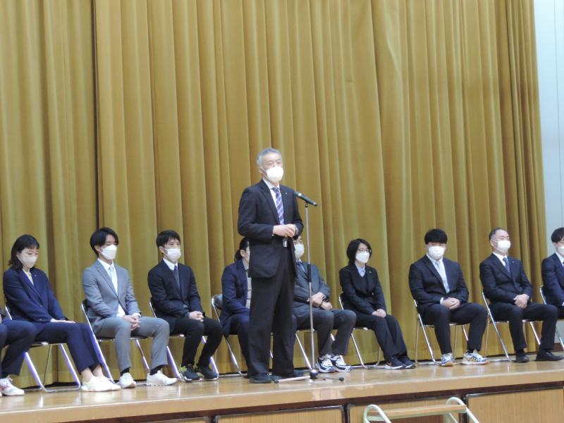 新任式で挨拶する久保教頭                任命式で挨拶する生徒会長