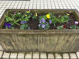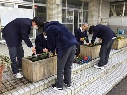 最後の授業では、生徒玄関前のプランターに春の花壇苗を植えました。