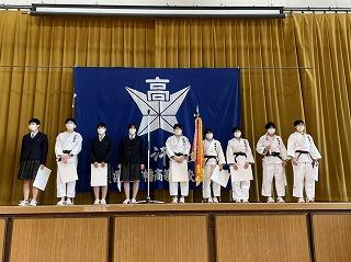 報告会では、今年の1~2月にかけて行われた大会を中心に報告がありました。また、運動部の大会だけでなく、授業中に取り組んだ「俳句」や「明るい選挙啓発標語コンクール」で受賞したという報告もありました。