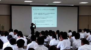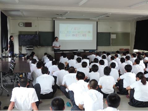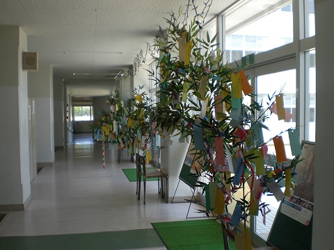 この講座の後、人権に関する標語を作成しました。自分の思いを標語で表すことに苦労しながらも、真剣に考える生徒たちの姿が印象的でした。その成果を、七夕の日に生徒玄関に飾りました。