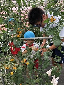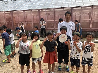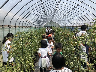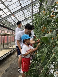 7月25日に「もりもりくらぶ」の方々と、食農・環境教育プログラム(ミニトマト・ナスの収穫)を行いました。夏休みというとこともあり、約40人と過去最多の児童が参加してくれました。