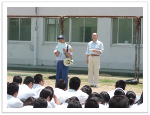 交通安全講話では、今年度1,2年生に行った自転車マナーに関するアンケートの集計結果をもとに、理解度の低かった交通ルールや、交通標識に関する説明をしていただきました。また、自転車の運転でも、自動車の運転手同様に事故があった場合は加害者となるという事も強調して話され、交通安全に対する意識を高く持ち、安全に夏休みを過ごすよう話されました。