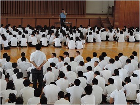 非行防止講話では、高校生の深夜徘徊から、最近話題となっている脱法ドラッグのことを実話を踏まえて、幅広い犯罪行為やそれに対する処罰の内容に対して話していただきました。夏休み中、くれぐれも事件・事故に巻き込まれないよう注意喚起し、講話を締めくくられました。