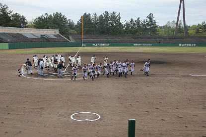 ベンチで歓喜の輪ができました。応援席も声を限りに応援したかいがありました。