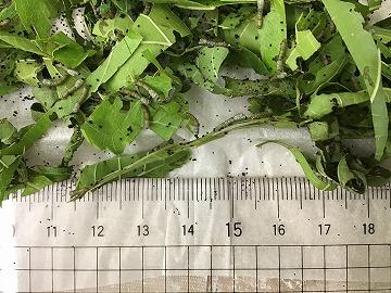 昨日は黒かったのにもう、とういうかいつの間にか、ほんのり白みを帯びてきました。生徒たちは、これから約1か月に渡って朝・昼・夕に桑の葉を与えます(給桑作業)