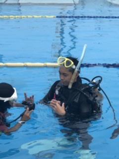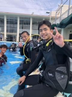 プールで明日の海洋実習に向けて、実際にタンクを担いで潜る練習をしました。