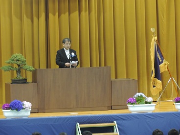 ↓青いウェアの現地指導員さんと開校式です。 | ↓生徒代表による挨拶です。 |