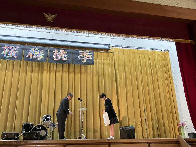 各クラスが考案した中から投票により今年の文化祭のテーマは【桜梅桃李~個性集まる津高祭~】となりました。採用されたクラスの代表者には校長より記念品が贈呈されました。